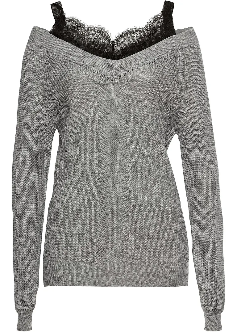 Schöner Ajour-Pullover von Bodyflirt. Der Pullover hat einen weiten V-Ausschnitt und einen Spitzeneinsatz. Optische Länge bei Gr. 36/38 ca. cm.