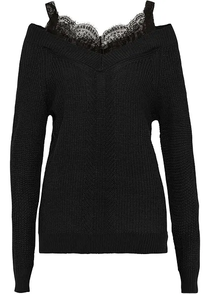 Schöner Ajour-Pullover von Bodyflirt. Der Pullover hat einen weiten V-Ausschnitt und einen Spitzeneinsatz. Optische Länge bei Gr. 36/38 ca. cm.