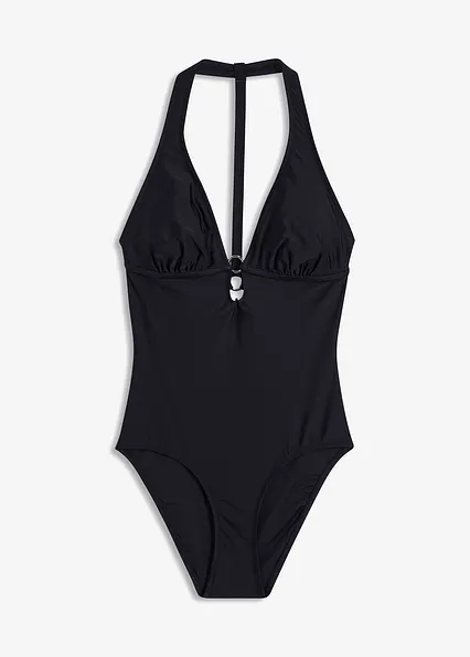 Dieser raffinierte Badeanzug macht in Sachen Aufmerksamkeit jedem Bikini Konkurrenz. Das attraktive Modell präsentiert sich vorne und hinten mit einem tiefen Ausschnitt. Am Dekolleté setzt ein dekorativer Ring einen Akzent und rückseitig fällt der Badeanzug mit seinem Ringerrücken sowie einem Cut-Out auf.Ein Brustfutter, herausnehmbare Softcups und ein Unterbrustgummi sorgen für einen sanft modellierenden Effekt. Der Badeanzug eignet sich vor allem für A- und B-Cups.
