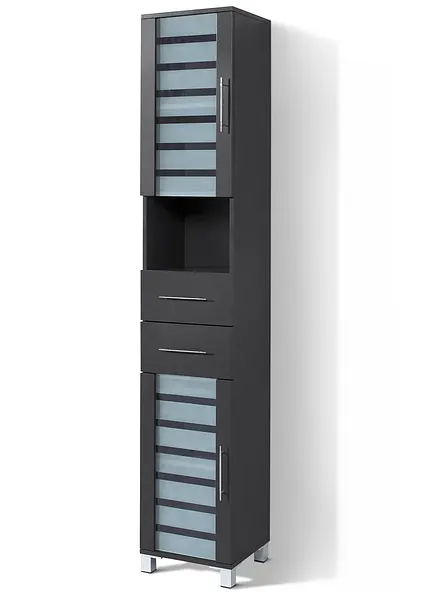 Der schmale Hochschrank "Ted" stellt eine praktische und zugleich dekorative Erweiterung der Badezimmereinrichtung dar. Besonders geschmackvoll präsentieren sich die teilweise gefrosteten Fronten, die dem Schrank einen modernen Charme verleihen. Zudem erweist sich der Hochschrank als Platzwunder. Ablagemöglichkeiten bietet er in Form von Holzeinlegeböden hinter den Türen und einem offenen Fach. Der schmale Hochschrank "Ted" ist in verschiedenen Farben erhältlich und fügt sich somit harmonisch in das vorherrschende Einrichtungskonzept.