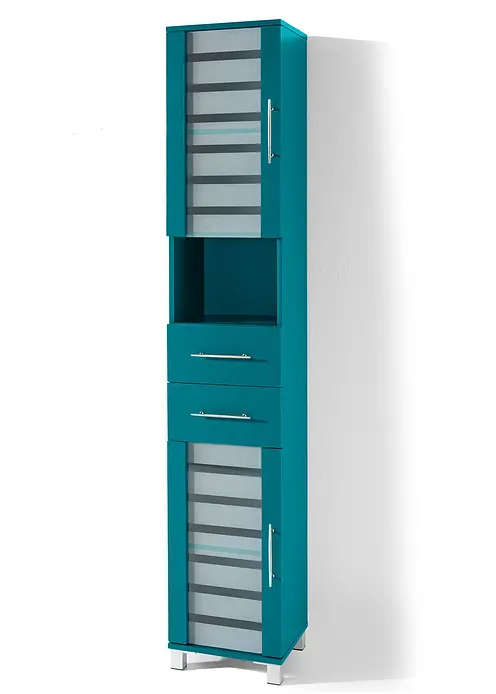 Der schmale Hochschrank "Ted" stellt eine praktische und zugleich dekorative Erweiterung der Badezimmereinrichtung dar. Besonders geschmackvoll präsentieren sich die teilweise gefrosteten Fronten, die dem Schrank einen modernen Charme verleihen. Zudem erweist sich der Hochschrank als Platzwunder. Ablagemöglichkeiten bietet er in Form von Holzeinlegeböden hinter den Türen und einem offenen Fach. Der schmale Hochschrank "Ted" ist in verschiedenen Farben erhältlich und fügt sich somit harmonisch in das vorherrschende Einrichtungskonzept.