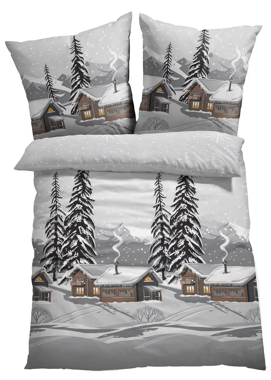 Bettwäsche mit Berghütte in Schneelandschaft