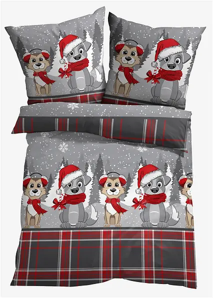 Bettwäsche mit Hunden die Mützen oder Ohrenschützer tragen, dazu der Schnee-Look im Hintergrund