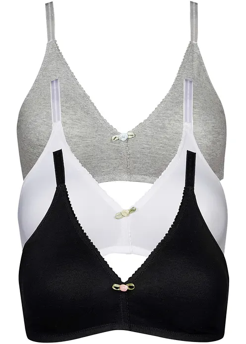 Dieser praktische Dreierpack von bpc bietet den Komfort von bügellosen und nahtlos vorgeformten BHs. Dazu schmeichelt eine ausgewogene Mischung von Bio-Baumwolle und Elasthan angenehm der Haut.Das natürliche Design des BHs mit eleganter Cupform und schmalen Trägern wirkt wunderbar frisch und attraktiv. Als besonderes Detail ziert jeden BH ein kleines farbiges Blumen-Accessoire.