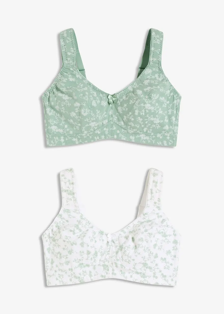 Der BH ohne Bügel bietet mit seiner schönen Bio-Baumwollqualität angenehmen Tragekomfort. Das weiche Material schmiegt sich perfekt an und die leicht gepolsterten Träger entlasten die Schulterpartie.Im attraktiven Doppelpack sind zwei BHs ohne Bügel aus der bpc collection mit einem verspielten Blumendruck enthalten. Dieser ansprechende BH vereint bequemes Tragegefühl und modisches Design.
