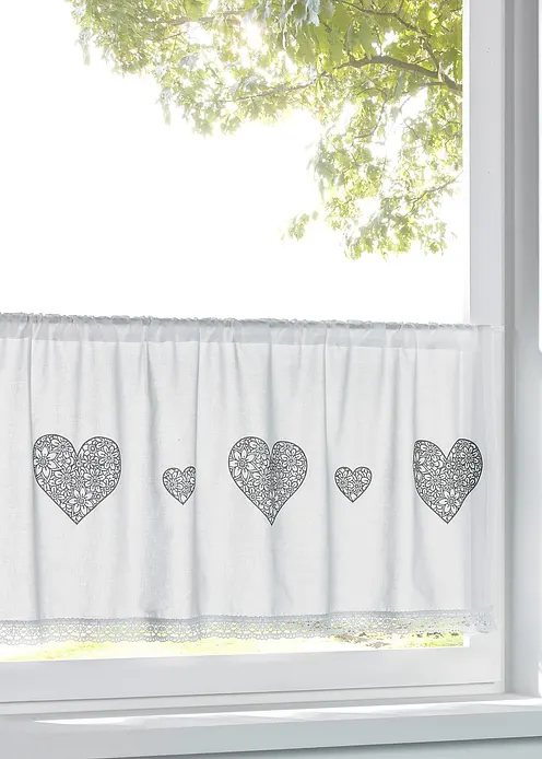 diese Küchengardine vereint einezarte Spitzenkante mit verzierten Herzen!