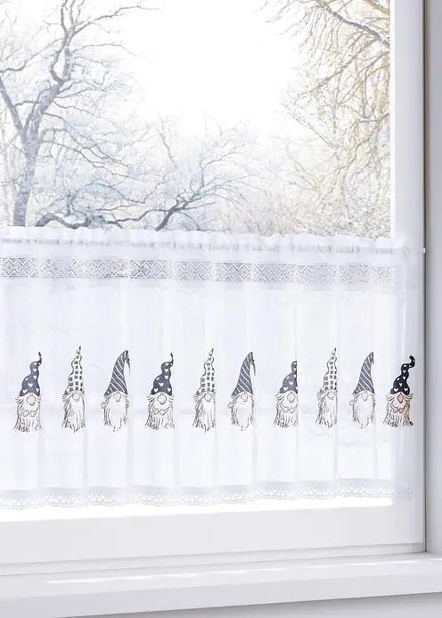 Halbtransparente Scheibengardine mit niedlichen Wichteln und Spitze am oberen und unteren Abschluss.