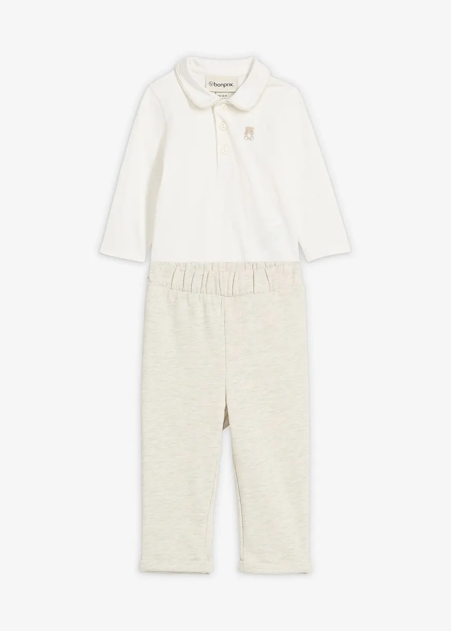 Süßes Jersey-Set aus Langarmbody mit Bubikragen + Teddy-Stickerei und Schlupfhose