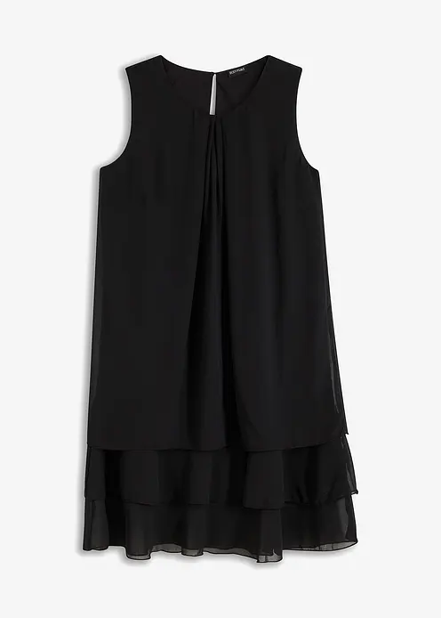 Feine Finessen setzen die klare Silhouette dieses Modells raffiniert in Szene. Dazu gehören die kleinen Falten am Rundhalsausschnitt, die von dort aus im locker fallenden Stoff verlaufen. Ein mehrlagiger Volant am Saum verleiht dem Chiffonkleid einen romantischen Touch. Die A-Linie umspielt sanft den Körper.Mit Glitzersteinen verzierte Ohrringe und Armbänder sowie dezente Pumps gehen mit diesem ärmellosen Chiffonkleid von BODYFLIRT eine hinreißende Verbindung ein.