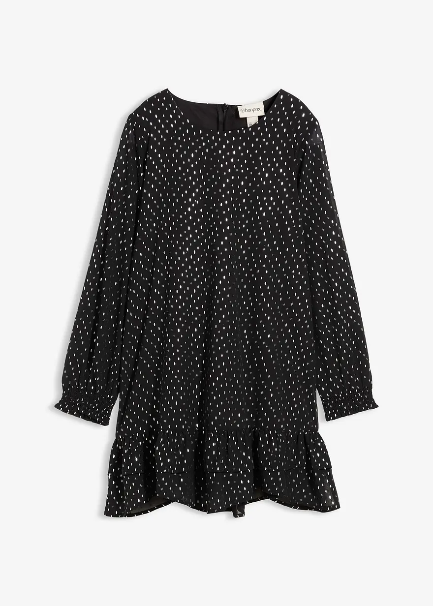 Dieses elegante Chiffonkleid vereint Stil und Verspieltheit! Mit einem runden Halsausschnitt und einer regulären A-Linie in Mini-Länge bietet es einen klassischen Look. Die langen, eingesetzten Ärmel haben gesmokte Säume, die dem Kleid eine besondere Note verleihen.Ein verdeckter Reißverschluss im Rücken sorgt für ein nahtloses Design, während der Ruffle-Saum mit ungleichmäßigem Abschluss für einen verspielten Touch sorgt. Verziert mit silbernen Allover-Folienpunkten und vollständig gefüttert, ist dieses Kleid ideal für besondere Anlässe!