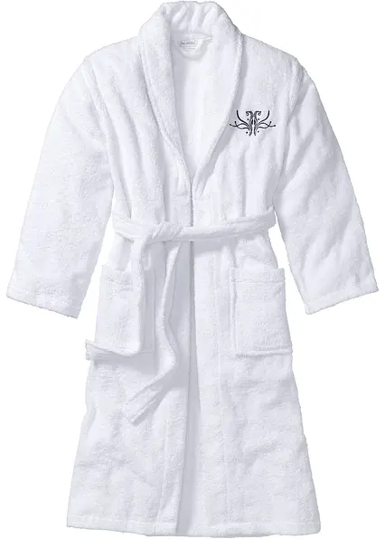Der Frottee Bademantel ist aus flauschiger Baumwolle gefertigt und sorgt für ein behagliches Tragegefühl. Das schöne Modell zeigt sich im klassischen Schnitt mit einem Bindeband zum Fixieren und mit zwei aufgesetzten Taschen vorne. Die kleine Stickerei neben dem Kragen setzt einen stilvollen Akzent. Als komfortabler Begleiter beim Saunagang macht der Bademantel eine gute Figur.