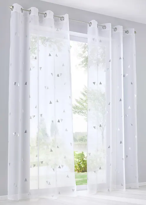 Gardine aus transparentem Voile mit aufgedruckter Musterung aus silberfarbenen Dreiecken in verschiedenen Richtungen. Die Dreiecke bestehen aus kleinen Streifen, die im Glanzdruck aufgebracht werden. Schlichte Eleganz mit einem Hang zur Extravaganz - diese Gardine ist etwas ganz Besonderes!