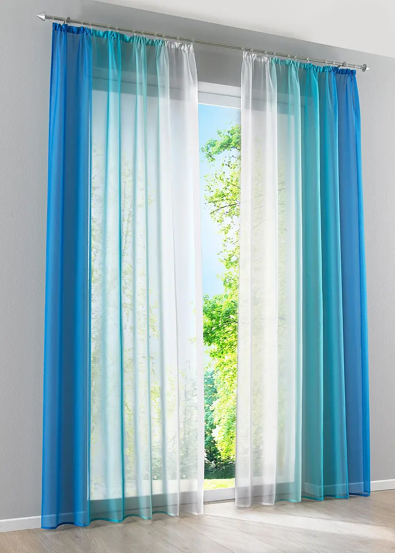 Ein toller Hingucker für deine Fenster: moderne Gardine mit einem frischen Farbenverlauf im praktischem 2er-Pack. Die Gardinen sind aus leichter transparenter Voile-Qualität und lassen dadurch viel Tageslicht rein.