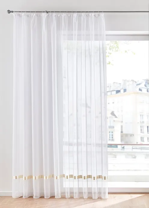 Stilvolle Fensterdekoration: der transparente weiße Store hat als besonderen Blickfang im unteren Abschluss ein Satinband aufgenäht. Die Gardine ist für viele Fenstergrößen geeignet, speziell für Blumenfenster und Terrassentüren. Das Beschwerungsband sorgt für einen tollen Fall des Stores. Wir empfehlen die 3-fache Fensterbreite zu bestellen, um die Gardine durch Kräuseln optimal zu dekorieren.