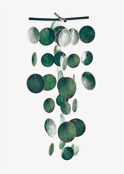 Windspiel für In- und Outdoor, die Anhänger wurden aus der Schale der Capiz-Muschel gewonnen, Länge inkl. Aufhänger ca. 75cm.