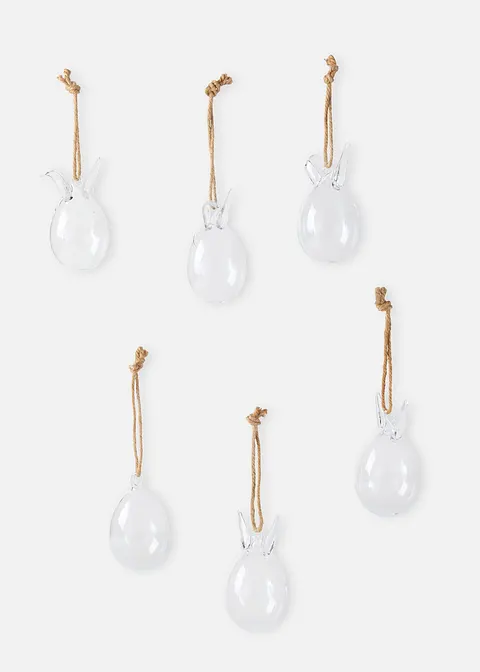 Dieses 6er-Set an gläsernen Hasen-Hängeornamenten bringt frühlingshaften Zauber in jedes Zuhause. Die filigranen Details und das klare Glasdesign machen diese Anhänger zu einem Blickfang in jeder Osterdekoration. Ideal zum Aufhängen an Zweigen, Fenstern oder als besondere Verzierung an Geschenkverpackungen.