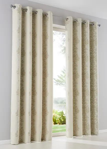 Dieser abdunkelnde Vorhang hat durch seinen schweren Stoff energiesparende Eigenschaften: warme Sonnenstrahlen oder kalte Zugluft kann abgefangen werden. Das edle Ornament-Design befindet sich auf der Vorder- und Rückseite, denn der Vorhang ist im hochwertigen Jacquard-Verfahren gefertigt. Die doppelte Breite (270cm) ist mit einer Mittelnaht verarbeitet.