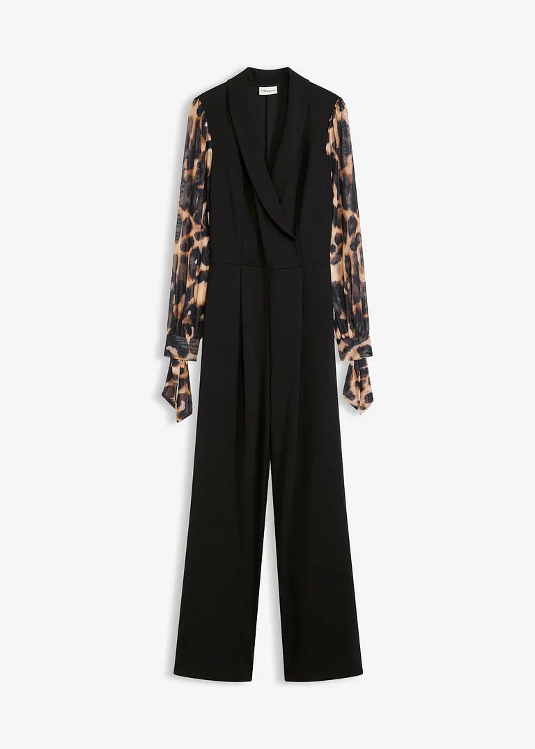 Jersey-Jumpsuit mit Mesh-Ärmeln in schwarz von vorne - bonprix