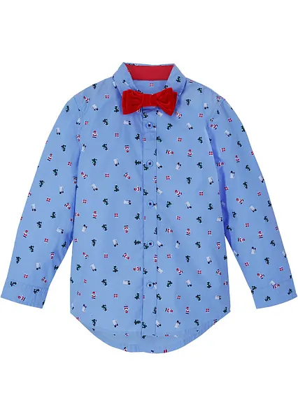 Dieses Hemd mit kontrastfarbener Fliege im Slim Fit für Jungen ist ein echter Hingucker! Der weihnachtliche Allover Print fällt direkt ins Auge. Das Modell mit Kentkragen und einfacher Knopfleiste trägt sich wunderbar komfortabel. Die Manschetten sind dekorativ mit Schlitz und Knöpfen gearbeitet.