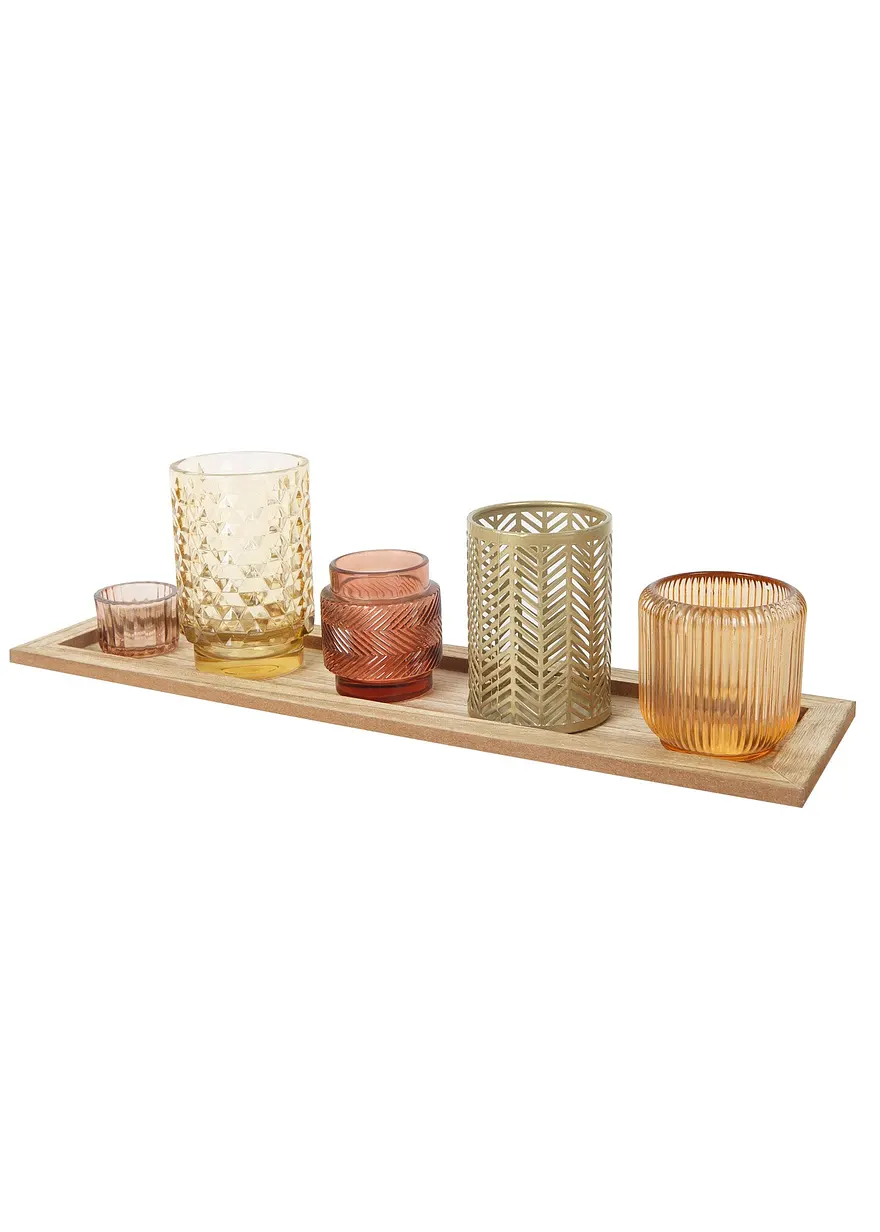Tablett mit 4 verschiedenen Teelichthaltern aus Glas und 1 Teelichthalter aus Metall. Ergibt mit eingesetztem Teelicht ein stimmungsvolles Ambiente.
