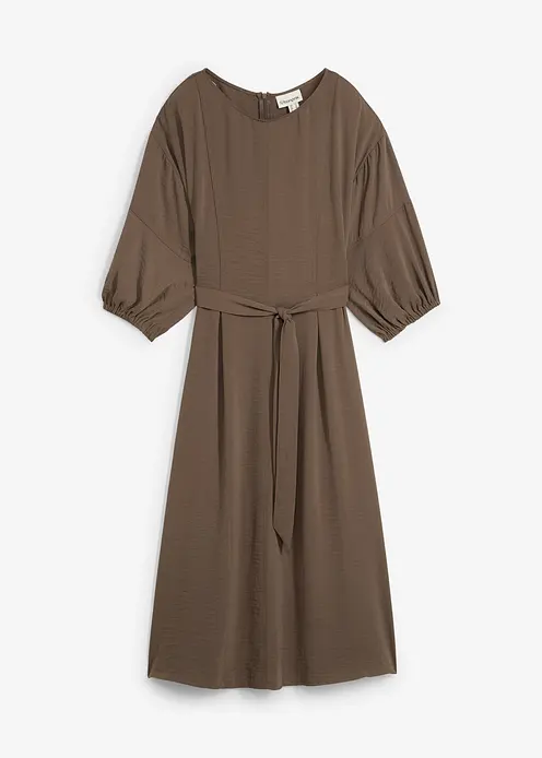 Midi-Kleid aus Webstoff mit rundem Ausschnitt und verlängerten kurzen Ärmeln mit Gummizug. In der Taille ein abnehmbarer Gürtel sowie ein verdeckter Reißverschluss hinten