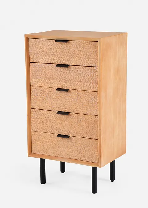 Entdecke unseren einzigartige Schubladen Kommode! Mit fünf geräumigen Schubladen und einem ansprechenden, strukturierten Design ist sie nicht nur praktisch, sondern auch ein echter Hingucker in jedem Raum. Die Kombination aus warmem Holz und modernen schwarzen Akzenten verleiht Deinem Zuhause einen stilvollen Touch. Perfekt für das Schlafzimmer, den Flur oder das Wohnzimmer! Hol dir jetzt dieses Möbelstück und bringe Ordnung und Stil in dein Zuhause!
