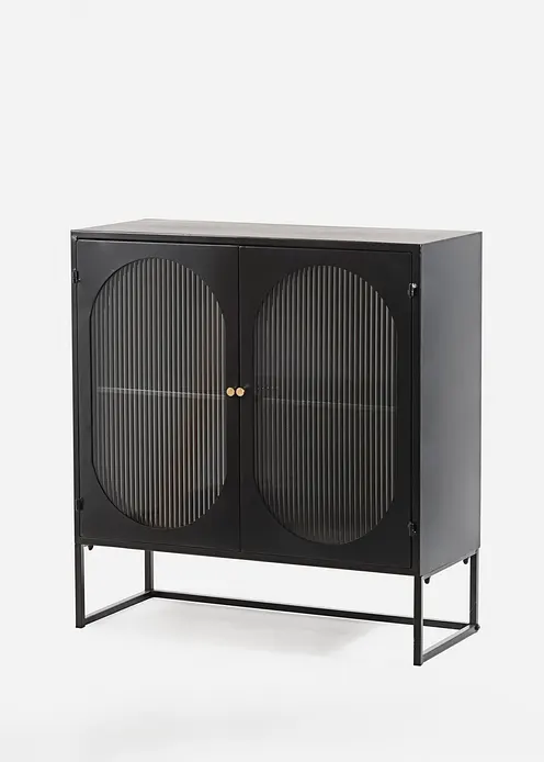Kommode in modernem und minimalistischen Design, das sowohl Stil als auch Funktionalität vereint. Die klare schwarze Oberfläche und die eleganten, gerippten Glastüren verleihen dem Schrank eine zeitgemäße Ästhetik, während die goldenen Knöpfe Raffinesse hinzufügen. Innen bietet der Schrank ausreichend Stauraum für Geschirr, Bücher oder andere persönliche Gegenstände, sodass Ordnung und Eleganz Hand in Hand gehen. Die schlichte Form und die geschmackvollen Details machen dieses Möbelstück zu einem perfekten Highlight in jedem Raum, das sowohl praktisch als auch dekorativ ist.