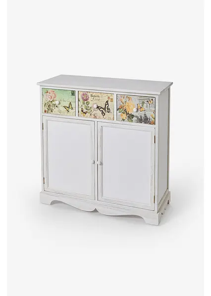 Diese Kommode begeistert mit ihrem wunderschönen Vintage-Look. Sie zeigt sich mit besonders schönen Verzierungen und einem romantischen Print auf den drei Schubladen. Darin befindet sich Platz zur Unterbringung von Kleinutensilien, während hinter den zwei Türen, Geschirr, Unterlagen oder Kleidungsstücke aufbewahrt werden können. Auf der Ablagefläche oberhalb lassen sich zudem Dekoarrangements oder Blumen aufstellen. Die Lieferung erfolgt aufgebaut. Diese attraktive Kommode erweist sich als toller Hingucker im Wohnraum.