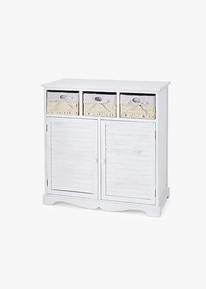 Schickes Stauraumwunder: Diese Kommode begeistert durch ihr wunderschönes Design, da sie im mediterranen Landhausstil daherkommt. Die Lamellentüren sowie die mit Stoffeinsatz versehenen Körbe sind ein echter Hingucker. Besonders hübsch ist auch die weiße Wischoptik, die der Kommode ihren besonderen Charme verleiht. Reichlich Stauraum befindet sich in den drei Schubladen sowie hinter den beiden Schranktüren, wo sich ein Einlegeboden befindet. Wunderschön und praktisch: Diese Kommode setzt daheim harmonische Akzente.