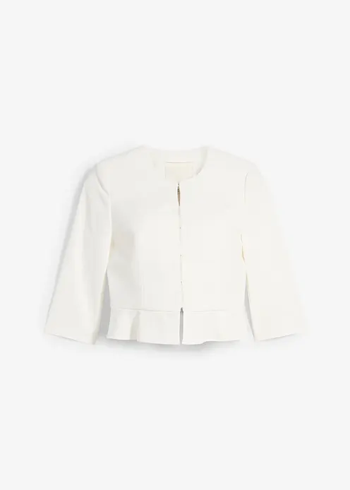 Kurzer Blazer mit Rundhalsausschnitt aus gewebtem Satin mit seidigem Glanz. Die Ärmel haben eine schmeichelnde leicht verkürzte Länge. Der Saum ist mit einem Schößchen versehen und die Jacke lässt sich mit filigranen Haken und Ösen schließen.