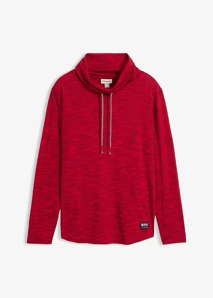 Dieses lässige Herren Langarmshirt von bpc punktet mit tollen Gestaltungselementen. Der breite Kragen lässt sich als Schal- oder Rollkragen tragen und mit einer auffallenden Kordel regulieren. Die Melange-Optik ergänzt das coole Design. Das komfortable Langarmshirt mit Schalkragen im Regular Fit ist locker geschnitten. Es passt zu legeren Hosen wie Jeans und Cargos.