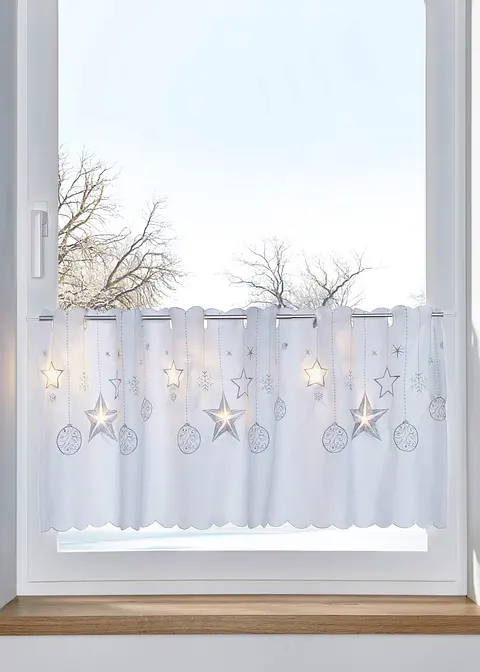 Mit dieser kleinen Scheibengardine ist dein Fenster ideal weihnachtlich geschmückt. Ein hübsches Motiv mit Sternen und Christbaumkugeln ist im Digitaldruck angebracht. Die stimmungsvollen LED-Lichter im Hintergrund geben eine warme, indirekte Beleuchtung. Je nach Maß ist die Anzahl der kleinen Lämpchen unterschiedlich. So haben die Größen mit einer Breite von 85 cm jeweils 4 Lichter, bei einer Breite von 115 cm sind es 6 Stück und bei einer Breite von 155 cm sind es 8 LED-Lichter. Die Rückseite ist ohne Druck, die Lichterkette mit Batteriefach sind zum Waschen abnehmbar, die Lieferung erfolgt ohne Batterie (2 x AAA). Lochleiste passend für Stangen mit bis zu 3cm Durchmesser.