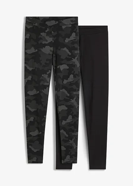Diese Leggings im Doppelpack punkten mit ihren unterschiedlichen Tragemöglichkeiten. Sie präsentieren sich als unifarbene Variante und mit einem Allover-Muster. Ein breiter Bund mit Rundumgummizug sorgt für einen wunderbaren Sitz.Ob als stylishes Keypiece für angesagte Sportswear mit Bustiertop, Sweatshirtjacke und Sneakern getragen oder in Verbindung mit einem Longtop und Sandalen: Die Leggings begeistern auf lässige und modische Weise.