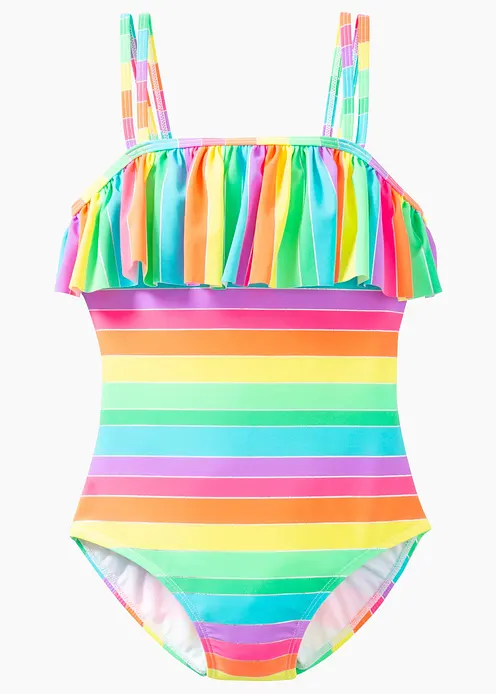 Der Badeanzug ist ein echter Hingucker in toller Streifenoptik und ist am Ausschnitt mit einem trendigen Volant verziert. Mit Spaghetti-Trägern für guten Halt.