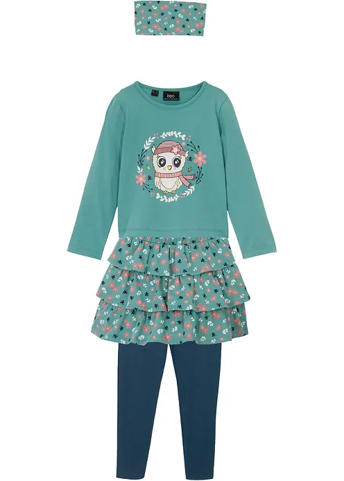 Dieses schöne Set ist ein absolutes Must-Have für alle trendigen Girls! Der geblümte Rüschenrock und der niedliche Eulen-Print auf der Vorderseite des Oberteils sorgen für ein besonders schönes Design. Die bequeme Leggings mit Gummibund und das geblümte Stirnband runden das Design ab. Dieses Set lässt sich zu Sneakern oder Balllerinas im Handumdrehen zu einem alltagstauglichen Look kombinieren.