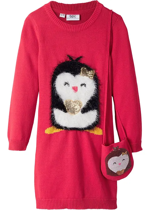 Weihnachtliches Strickkleid mit niedlichem Flauscheinsatz in Pinguin-Form und kleiner Tasche
