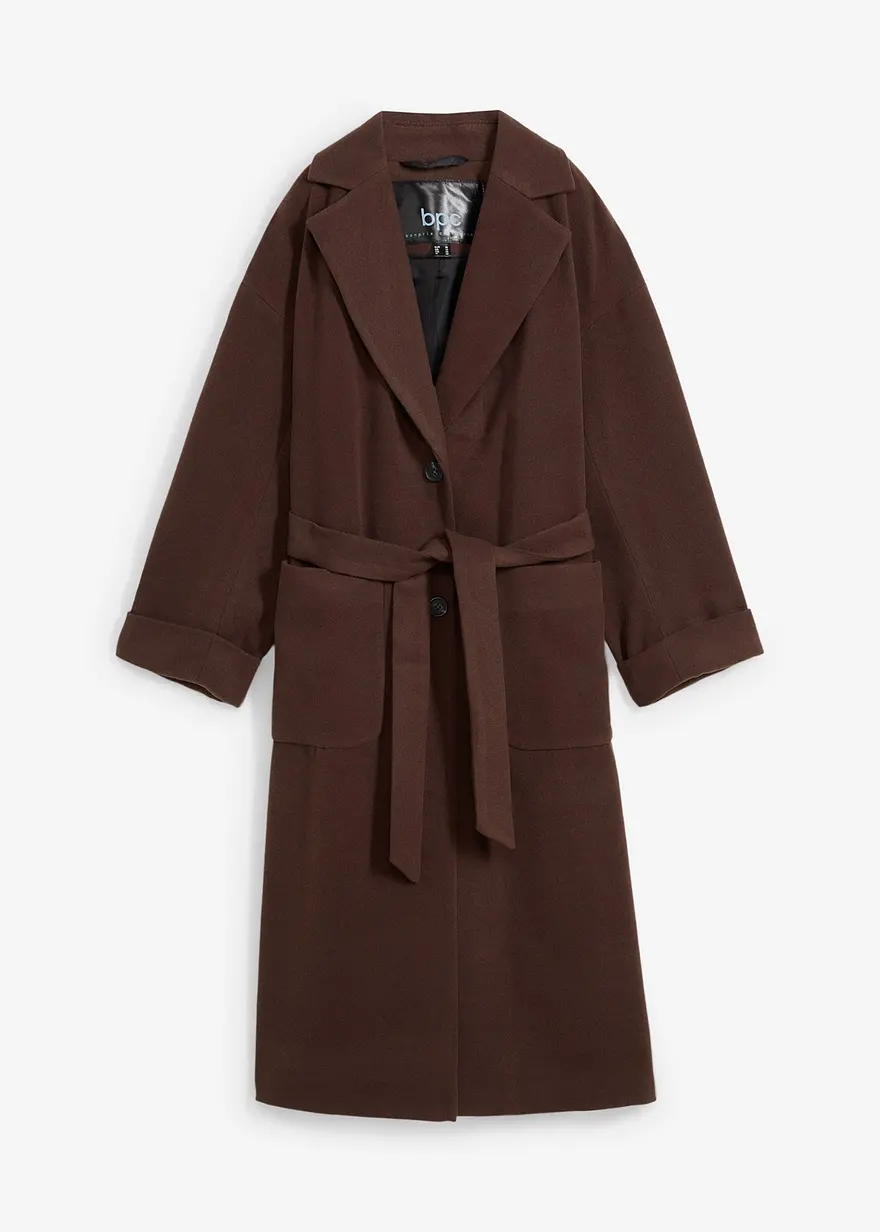 Moderner Wollimitat-Mantel mit Taschen und Bindegürtel