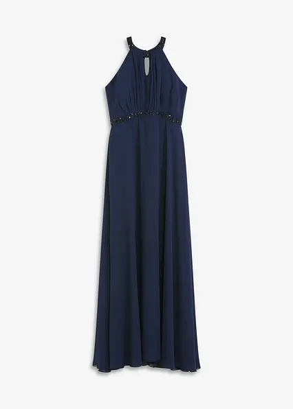 Modern und feminin: Abendkleid in Maxi-Länge mit Perlen-Applikation am Ausschnitt und Unterbrust-Einsatz.