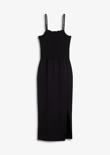 Midikleid aus festem Jersey mit Smockeinsatz und Schlitz in schwarz von vorne - bonprix