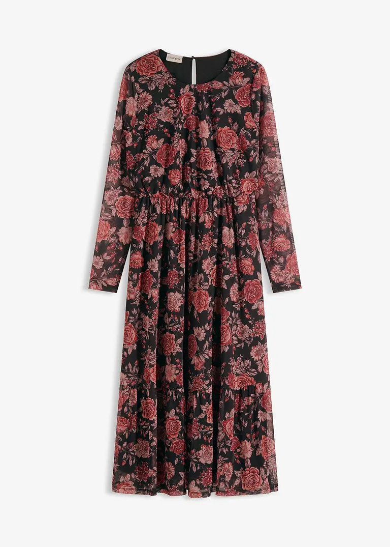 floral bedrucktes Jersey-Midikleid aus softem Mesh mit Volant am Saum
