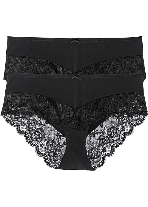 Bestehend aus einer Panty mit schlichter Hinterhose und einer mit einem edlem Spitzenband hinten.