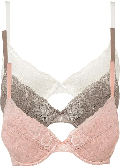 Basic-Push-up im 3er Pack: mit Bügel, leicht wattierte Cups aus Allover Spitze, mit herausnehmbaren Kissen, Cups mit Baumwollfutter, die vorderen Träger haben eine Doppeloptik bis zum Schulterpunkt. Handwäsche