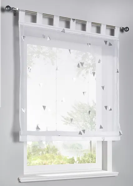 Dieses Raffrollo ist modern und schlicht zugleich. Ein toller Blickfang sind die aufgedruckten glänzenden Dreiecke in verschiedenen Richtungen. Die Dreiecke bestehen aus kleinen Streifen, die im Foliendruck aufgebracht werden.