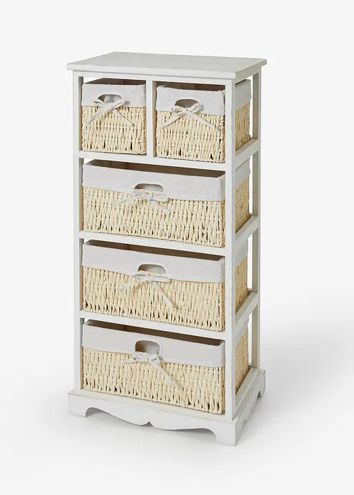 Mit Körben, Textileinlage herausnehmbar. Der aus 5 Schubladen bestehende Schrank ist ein echter Hingucker. Der trendige Landhausstil ist zu jeder Einrichtung kombinierbar. Dieser Schrank kann in der Diele, im Bad oder auch im Schlaf- oder Arbeitszimmer aufgestellt werden. Platz für Ihre Utensilien ist im Schrank reichlich vorhanden. Und zum Schutz sind die Körbe des Schranks mit einer Textileinlage ausgestattet. Der aus 5 Schubladen bestehende Schrank ist besonders leicht und zeitlos schön.