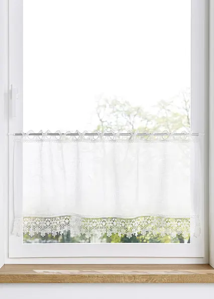 Diese Scheibengardine im romantischen Stil wird dich verzaubern. Sie schmückt dein Kleinfenster auf zarte Art, es ist schlicht gehalten mit einer feinen Häkelkante am Abschluss. Es ist passend zum Landhaus-Stil, aber auch zu anderen Stilen mit natürlichem Touch. Passend für Stangen mit bis zu 3cm Durchmesser.