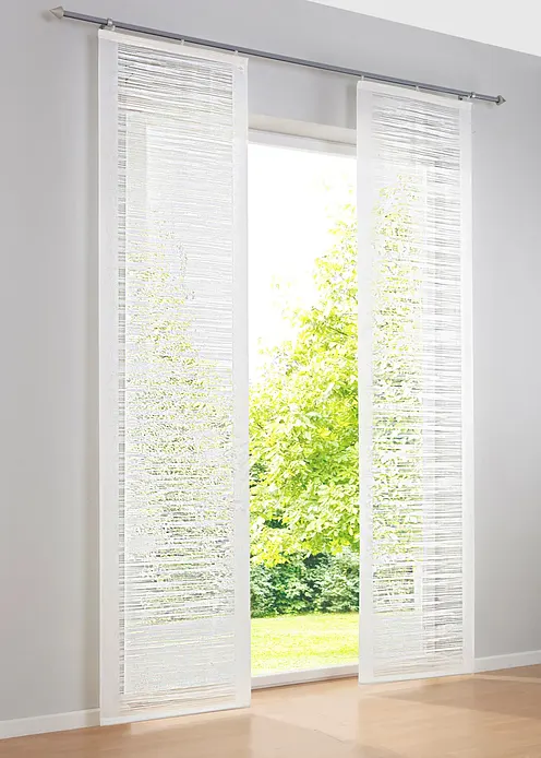 Moderne Schiebegardine aus halbtransparenter Stoffqualität. Das dezente Streifendesign ist durch das Scherli-Verfahren hergestellt und hat somit trendige fransige Kanten. Erhältlich in verschiedenen attraktiven Wohnfarben.