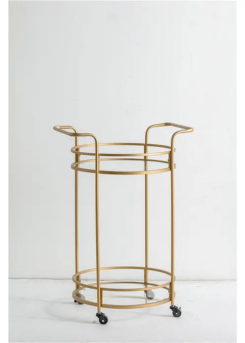 Dieser goldfarbene Servierwagen bringt einen Hauch von Glamour in dein Zuhause. Mit seinem schlanken, modernen Design und den praktischen Griffen ist er ideal, um Drinks oder Snacks stilvoll zu präsentieren. Die stabilen Rollen ermöglichen eine mühelose Mobilität, sodass du ihn überall hin bewegen kannst – sei es für eine gemütliche Zusammenkunft oder ein elegantes Dinner. Verleihe Deinem Zuhause einen besonderen Akzent und genieße die Kombination aus Funktionalität und Ästhetik mit diesem exquisiten Möbelstück!