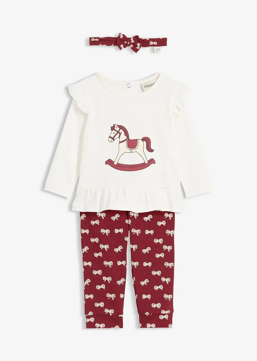 Niedliches Baby Outfit aus 100% Bio-Baumwolle mit Langarmshirt, Hose und passendem Haarband.