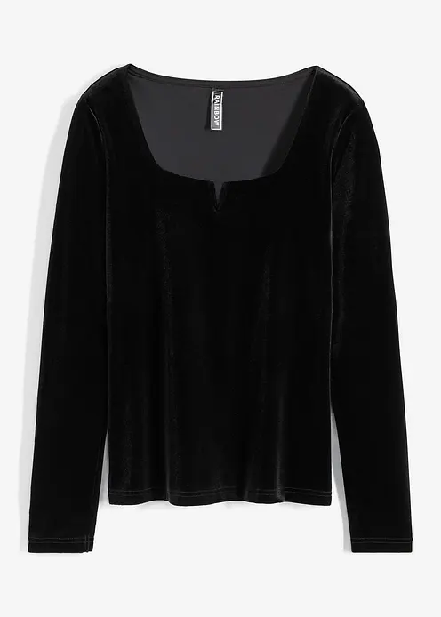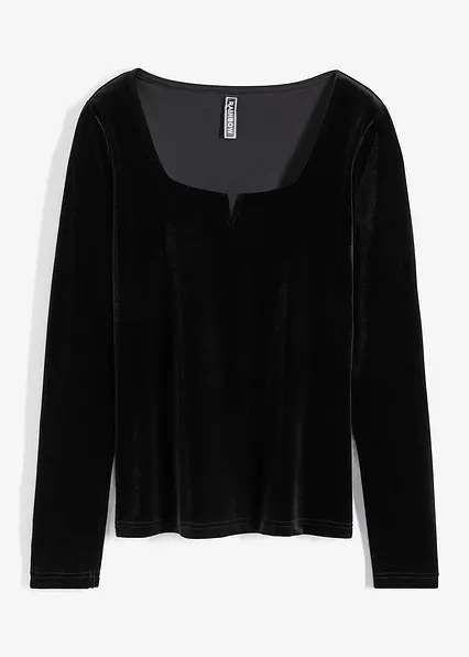 Feminines Shirt in Samtoptik mit tiefem Carré-Ausschnitt sowie Schlitz