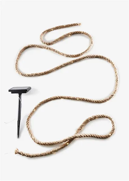 Mit Dämmerungssensor, Leuchtzeit ca. 8 Stunden, 50 warm-weiße LED´s, mit Akkutechnik NI-Mh 1x AA 1,2V 300mAh (Batterie enthalten). Mit An/Aus Schalter. Juteseil ca. 4m lang.